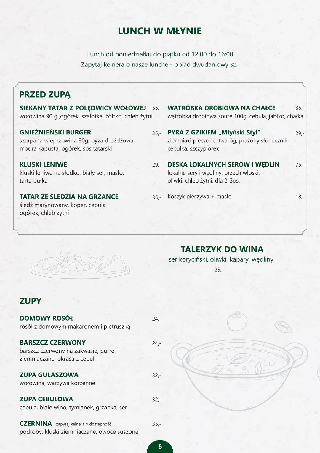 Młyn Restauracja to miejsce, które łączy pyszną polską kuchnie z wyśmienitymi cocktailami i winami ze wszystkich stron świata. Doskonała przestrzeń pozwala na organizacje wszelkich imprez prywatnych jak i firmowych. II piętro to dopełnienie artystycznej duszy Młyna! Scena, która zbudowaliśmy jest przygotowana na wydarzenia kulturowo artystyczne jak i komercyjne. Będziemy częstować Was smakami polskiej kuchni w autorskiej odsłonie menu szefa Marcina Łaczkowskiego. Królować będzie tradycja z lekką nutą nowoczesności. Bar ugasi Wasze pragnienie znanymi jak i całkowicie nowymi doznaniami, które zapamiętacie na bardzo długo. gniezna